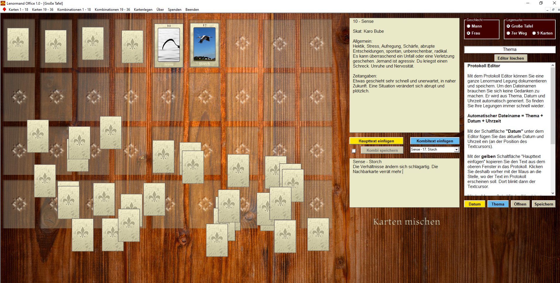Mit der großen Tafel können Sie alle 36 Karten (4 x 9) auslegen (oder weniger) und die Karten Kombinationen ergründen. Sie können die Kombitexte nach Ihren Vorstellungen ergänzen, verändern und speichern.