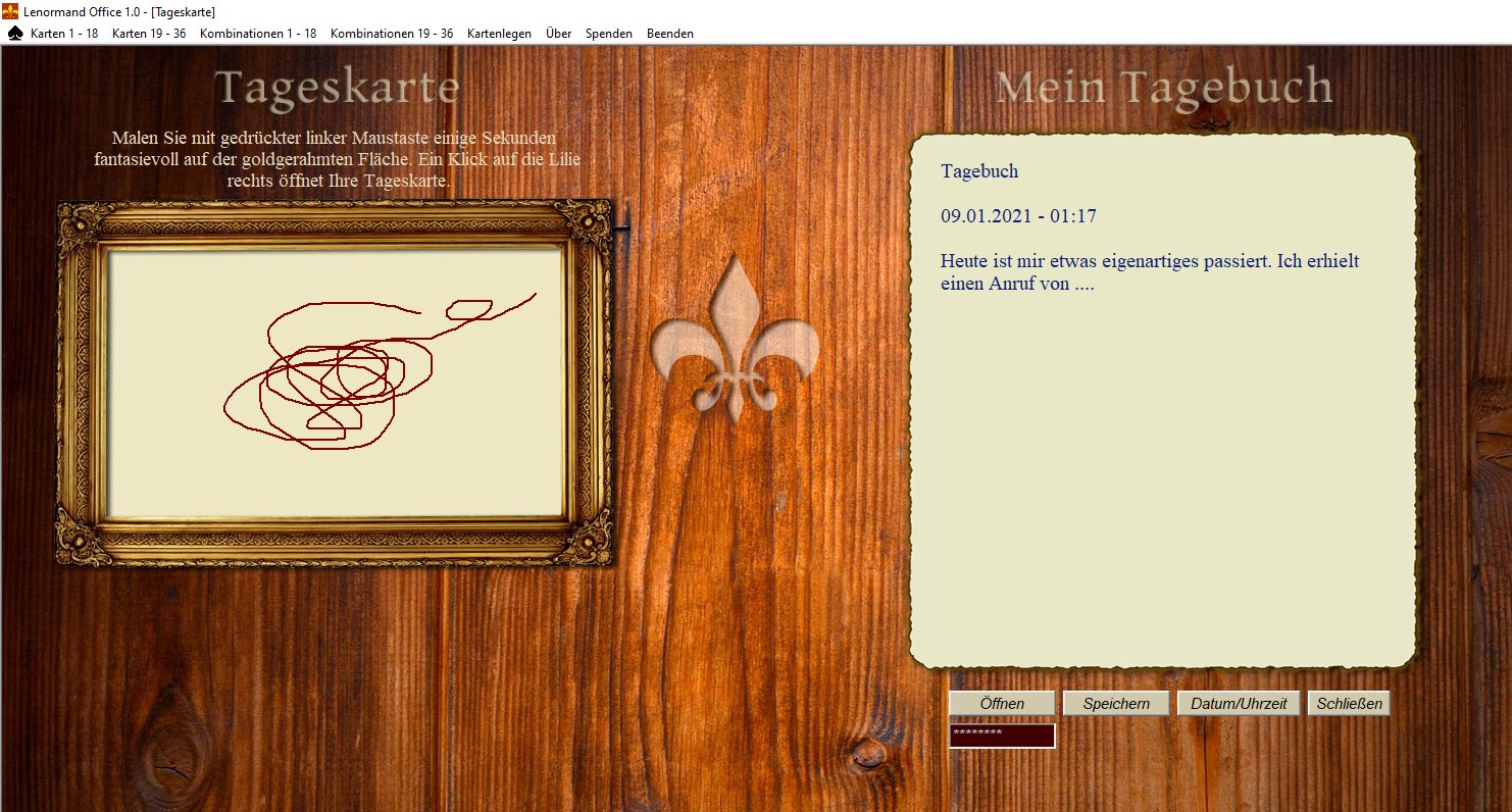 Nachdem Sie auf den Button "Schließen" geklickt habe, werden Sie eingeladen, eine Tageskarte zu ziehen und Ihr passwortgeschütztes Tagebuch zu pflegen. Malen Sie fantasievoll im Bilderrahmen umher und klicken Sie dann auf die Lilie.